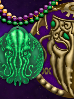Shown above: artist renderings of Cthulhu Mardi Gras beads, traditional bauta carnival mask (but with a Lovecraftian twist), and shiny Cthulhu doubloons.